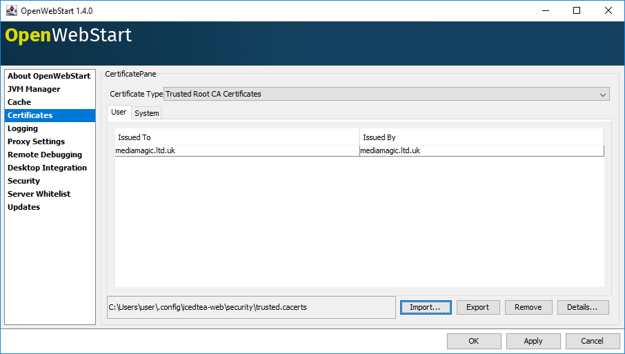 You will see mediamagic.ltd.uk in the root certificates list when the import is complete.