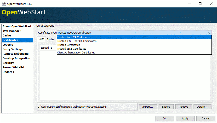 Open the Open Webstart Settings from either the Start Menu or the Application launcher.