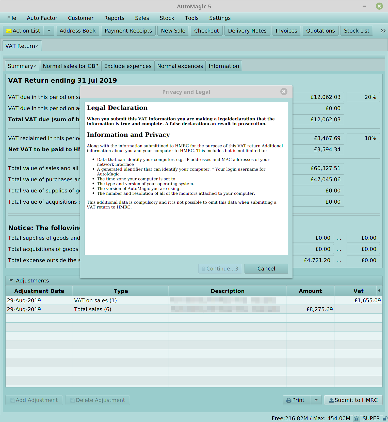Read the legal declaration and hold the mouse cursor over the Continue button for 3 seconds to activate the button. Click the Continue button to submit the VAT return