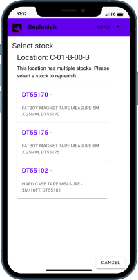 This screen shows the product to be replenished, and the possible storage locations containing the stock.